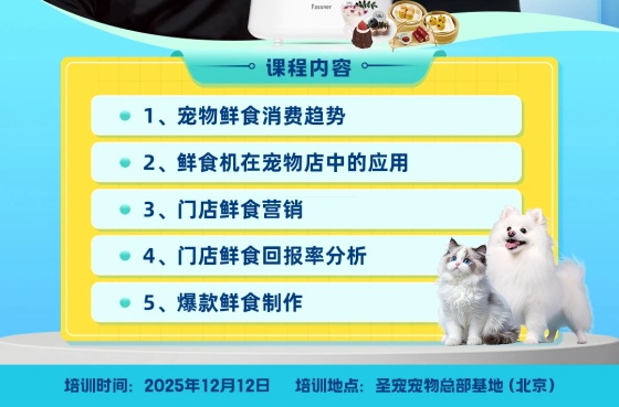 12.12鲜食大师课,教你如何用一台鲜食机打开新世界!你是否也在思考:如何让店铺在激烈的市场竞争中脱颖而出?如何找到店铺持续增收的新途径?答案就在这里——【圣宠宠物鲜食大师课】一台鲜食机,轻松开启宠物新赛道一人也能轻松操作,宠物门店营收新引擎!为什么消费者需要宠物鲜食·天性喂养,提升宠物情绪及人宠关系·多...